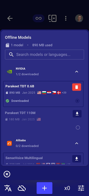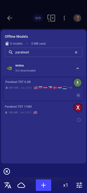 - You will be taken to the offline models download page. Select the Parakeet TDT 0.6B model for NVIDIA: